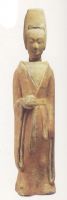 泥質灰陶。俑採立姿。頭戴黑色籠冠,面龐圓潤豐滿,長眉細目,鼻梁高挺。身穿交領右衽廣袖衫,下著長裙,腰繫帶。右臂彎曲置於腰部,手作持物狀;左手籠於袖中,自然下垂。