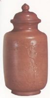 侈口,圓唇,短頸,豐肩,筒形腹,圈足。附蓋,蓋面隆起,寶珠形鈕。罐身模印花紋,一面為山石梅花圖,梅枝清瘦,韻致秀雅。另一面為乾隆御題詩《雨中烹茶泛外遊書室有作》。此壺造型質(zhì)樸,構(gòu)思巧妙,雕琢精細(xì),氣韻天成。為“曼生”紫砂壺中的珍品。