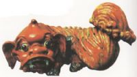陶胎。獅為伏臥狀,施石榴紅釉。明清石灣窰以其豐富的造型和五彩繽紛的釉色著稱於世,窰變釉為石灣窰的釉中之冠,其中石榴紅為其代表,釉色鮮艷,華而不浮。