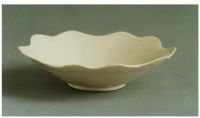 口沿為十瓣花口,淺腹矮圈足,外得腹壁見有流釉現(xiàn)象,并留有輸制痕跡,外底心草刻官字.釉色乳白,胎質(zhì)致密堅硬.