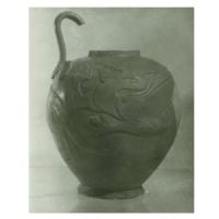 殘器有內(nèi)口,圓肩,圈足外撇,器身淺浮雕二龍搶珠,龍作三爪,龍身劃鱗,龍鱗上原貼有金片,出土?xí)r殘留三片,器下腹作云氣紋