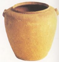 直口,短頸,豐肩,深腹,平底,胎體輕薄。肩部裝飾雙管狀壁繫一對,通體拍印蓆紋。