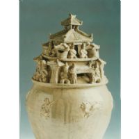 上部作堆塑,下部為罐.腹微鼓,平底,釉不及底.腹上部堆貼二鹿,四執(zhí)棒形人物.上部分三層,第一層前后作單門(mén)樓,以倒置獸頭作柱,門(mén)口左右各塑胡人一,闕人一.左右兩面均為胡人像三,第二層四小罐覆廡殿式頂,每面塑尖頂降月胡人二,雙手合胸.頂層作重式廡 殿頂.