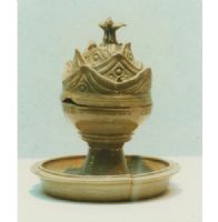 淺承盤,高足杯狀主體,子母口,口沿飾二道弦紋,蓋爐作山峰起伏狀,四層,每層四等距小圓孔通爐體,飾有圓珠紋,海水紋,蓋頂塑一飛鳥.底部無釉,中空.