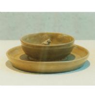 托盤(pán)平坦,直口圓唇,斜直壁,平底露胎,盤(pán)內(nèi)置一弦紋碗,碗底中央塑一展翅欲飛的鳥(niǎo),口沿流釉.