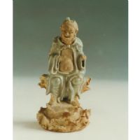 為一老者形象,身披蓑衣,腳踏草履.釉色青綠,面部和胸采用露胎裝飾技法.呈現(xiàn)赭紅色.