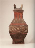鈁為敞口鼓腹,方形圈足,有蓋,蓋頂四角飾。通體以紅、白色彩繪出鋸齒紋、云氣紋。鈁即方形壺,用以盛裝酒漿或糧食,盛行於戰(zhàn)國(guó)末西漢初。陶鈁是仿銅禮器,西漢時(shí)期的墓葬中,多和陶鼎,陶敦等器成組出現(xiàn)。