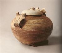 蓋呈弧面形,中心安一捉鈕。瓿身顯得矮而豐滿,其肩部粘附一對鋪首,鋪首寬大,上端超過口沿,并向外翻,鋪首面模印人面紋。
