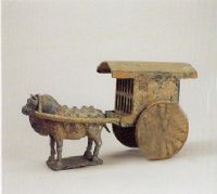 牛車車蓋呈圓拱形,前后伸出長檐。車廂兩側(cè)各刻一假窗,車廂前鏤空成欞格,廂后開門。開轅駕于牛頸之上。