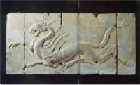 這是一組拼砌畫像磚,在七塊并列的長方體磚的側(cè)面分短模印組合成一虎紋,虎大張口,細(xì)長頸,身體彎曲,尾端上揚(yáng),身軀四肢雄健有力,既具有濃厚的裝飾意味,又透出山林獸王的雄威和祥瑞氣氛。