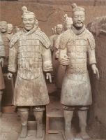 鎧甲武士俑是秦兵馬俑一號坑軍事陣中的組成部份。有的束發(fā)高髻偏於頭右上方,有的還帶上小皮帽,均為免盔武士。身首短裾,外套短鎧甲,護(hù)著前胸、后背及雙肩,腰束革帶,足蹬輕便靴。
