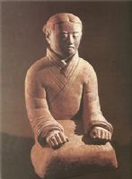 俑兩膝著地,臀部置於足跟上,作跽會(huì)姿式。面部表情凝重肅穆,腦后綰螺形發(fā)髻,身著交襟右袵長(zhǎng)衣,曲領(lǐng)高厚,腰束帶。俑身中空,為合模制成,頭和手均為另行燒制后安裝上去的。