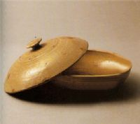 缽體為子母口,淺腹,圓餅形底,外壁口沿處兩道弦紋。蓋作覆盤狀,蘑菇形鈕,鈕上有五點(diǎn)褐彩。通體釉色淡青,開冰裂紋片。該物的造型和裝飾是較為典型的甌窯產(chǎn)品。褐彩在東晉時(shí)期浙江地區(qū)的制瓷業(yè)中風(fēng)靡一時(shí),而甌窯的褐彩形式多樣,有點(diǎn)狀、條狀斑塊等。排列組合也千變?nèi)f化。加以它潔白細(xì)膩的胎質(zhì)和淡雅的釉色,達(dá)到了明顯的裝飾效果。