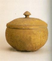 缽斂口,圓唇,鼓腹,平底,帶蓋,蓋為弧形,中央置一蘑菇鈕。通體施釉,釉色黃中泛綠,胎釉結(jié)合不好,已開始脫落。在這件青瓷帶蓋缽上,西晉繁復(fù)的裝飾已逐漸消失;從造型和胎釉諸方面來看,與長江下游東晉出土的同類器物相接近,可能是長江下游的產(chǎn)品。