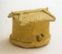 器為圓形茅舍狀,屋頂塑有溝檐。正面屋門半掩著,內設糞坑、腳蹬。門旁塑一洞孔,一狗正欲鉆入。施青釉,略泛青綠色。造型形象生動,民間生活氣息濃郁。