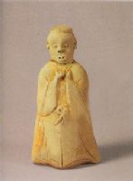 女俑頭梳發(fā)髻,髻中空。圓臉,大耳,耳下有墜,雙目圓睜,塌鼻,癟嘴。身著對襟長裙,寬袖,小臂裸露,雙手交置胸前。腰部與帶,腹前系成蝴蝶結(jié)。女俑通體未掛釉,素燒而成,呈青灰色。此俑不戴假髻,耳垂有飾,系西晉典型器。