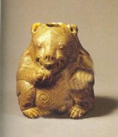 青瓷熊尊為灰色胎,青黃色釉,釉色允潤(rùn)。模制成型。造型作一熊踞坐吃食狀。一爪捧物置口前,一爪放腹上,矯健中而露憨態(tài),逗人喜愛(ài)。通體飾茸毛狀紋和卷曲紋。頂部有一圓孔,可能以插燭或作酒器或作水滴用。為六朝青瓷精品。