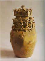 頂部為一建筑群,中間系一懸山頂建筑,四角各立一望樓。中部堆塑形態(tài)各異的人物。下部呈罐形,其上附貼牛羊等動物。