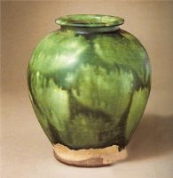 罐撇口無(wú)頸,圓肩斜腹,平底,外施綠釉,釉自然流淌但不到底。造型端莊秀麗,特別是綠色的釉沿著圓腹向傾斜面隨意地流淌,形成美麗、流暢、生動(dòng)的動(dòng)態(tài)美的圖案。從而產(chǎn)生了一種好似行去流水般的特殊藝術(shù)效果。這是一件唐代綠釉器中的優(yōu)秀作品。