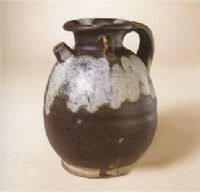 之間,另兩面各有一系,壺裹外均施釉,外部施釉不及底,釉呈黑褐色,口上有色斑紋三個,腹部兩面有不規(guī)則琉璃點(diǎn),斑點(diǎn)均為灰度藍(lán)色。