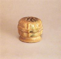 圓形,盒蓋與盒底子母口扣合,蓋項(xiàng)模印八角形凸花,蓋壁弧狀,上下口邊為多邊菱形,束脛,喇叭形圈足稍外撇。足底模印行書(張)字陽文。