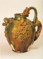 短頸,長圓形腹,平底。肩腹間飾龍首形流和龍形把手。流下印貼一獸頭,兩側(cè)肩腹間貼塑人物及花卉紋。通體施黃綠色釉,釉色鮮麗,流淌熔融,尤其是作品的貼塑工藝之精湛,構(gòu)思之奇巧,反映了唐代制陶工藝的發(fā)達,此類作品,傳世較稀少,是唐代彩色釉陶器中出類拔萃之作。
