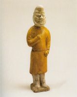 俑頭戴氈帽,深目高鼻,絡腮鬍須。身穿圓領窄袖黃色長袍,腰束帶,足著長筒靴。此俑係中年胡人形象。