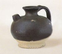 小壺撇口短頸,圓腹,短流,平底,一龍首柄連于口沿與壺腹之間。上半部施黑釉,釉色黑高,開有細小紋片。其施釉方法應屬蕩釉工藝,胎釉界線分明,無流淌現(xiàn)象。此器具有唐代典型風格,隨著時代的推移,此類小壺的流下不斷加長,而壺身也由扁圓而變得細長。