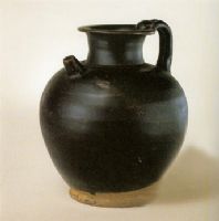 壺撇口,短頸,圓腹,腹上部豐滿,下部收斂,平底;壺身一側(cè)肩上凸起短流,現(xiàn)側(cè)以龍頭形曲柄連接于口肩之間,裹外施黑釉,外部施釉不到底,釉色光亮如漆,器型優(yōu)美穩(wěn)重。