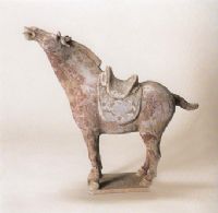 陶馬胎底青灰度,上繪赭紅色。四腿直立于長(zhǎng)方形踏板上,鞍韉俱全。陶馬伸頸昂首,馬鬃蓮然聳起,似在作嘶鳴抖擻,纏系著的馬尾屈翹,呈搖擺狀。藝術(shù)造型逼真生動(dòng),姿態(tài)極為雄健。