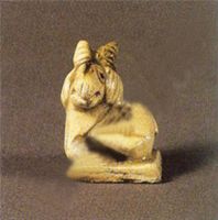 該件瓷羊跪臥于板座上,雙眼圓睜,平視前方,雙角直立,頸部毛髹分梳兩側(cè),嘴角微張,短尾下垂。通體施白釉,釉質(zhì)透明光亮,白色胎,額頭施褐彩加以點(diǎn)綴,神態(tài)自然,形象逼真,討人喜歡。整個(gè)造型采用捏塑、刻劃相結(jié)合的技法。