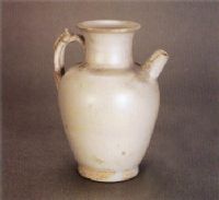 侈口,辱口外翻,粗頸,肩部豐滿向下漸收,假圈足。肩部一側(cè)為圓柱形中空短流,另一側(cè)為柄,由三根泥條捏合而成。胎質(zhì)發(fā)黃,器外施白釉,釉色勻凈,足部露胎,有垂釉痕;器裏施釉至勁部,餘無釉。