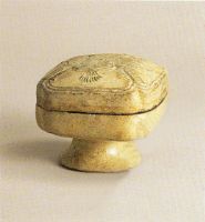 盒圓角扁方形,上下對稱,子母口扣合,直口,淺腹,喇叭形空心高足,蓋頂微凸模印三層四葉花紋。四角出盤內(nèi)山凹,盒壁圓弧。胎體輕薄,裏外施細(xì),釉色白中帶黃。足底坯上刻化(官)字款,字跡被釉覆蓋。