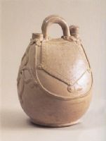 小口,半圓形提樑,鼓腹、平底、壺上飾凸起紋樣,即半浮雕,仿皮囊形作工,上部有鞍形裝飾,通體施白釉,微閃黃,胎白質(zhì)細(xì)堅(jiān)硬,中亞,西亞人經(jīng)(絲綢之路)到長安,常在馬或駱駝上帶裝水的皮囊馬蹬壺,以備路遠(yuǎn)口渴飲水用,白瓷馬蹬壺就是仿其澆制。