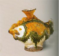 壺為魚形,魚嘴為壺流,背部有一喇叭狀菊花形注口,雨背一側為提梁,已遺失。魚腹下飾一荷葉,托舉整個魚體,底部為平底實足,施黃、綠、白三色釉彩。整體造型飽滿,魚似在搖首擺尾,噴吐水花,一副悠然自得之態(tài)。此壺集模印、貼花、堆塑、刻劃于一體,制作難度較大,為遼瓷中的精品。