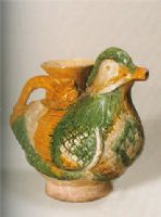 造型為浮水鴛鴦,背上有喇叭狀五瓣花形壺口,后部連接尾羽為一水波紋柄,鴛鴦頭部昂起,兩眼凝視前方,嘴部中空為流,腹下素面無釉,平底假圈足,全身釉色混凝,但整體黃、綠、白三彩鮮艷絢麗,翅膀羽毛範(fàn)模壓印而成,猶如浮雕,極富立體感。