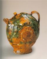 模制成型,壺為扁圓體,圓唇口,前置犧首管狀流,后置半環(huán)狀扁把與犧流相對(duì)應(yīng),口前置一環(huán)狀穿帶鼻,平底假圈足,足微外撇。淡黃色陶胎,堅(jiān)硬細(xì)膩,上白色化妝土,施黃、綠、白三彩釉。