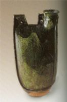 扁體高身,管狀口,唇沿,馬鞍狀雙孔系,圓底內(nèi)凹。紅陶胎,胎質(zhì)細(xì)膩,上白色化妝土,施深綠色釉,底足無釉。