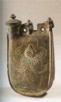 扁體高身,管狀口,圓唇,塔式蓋,螺絲狀鈕,馬鞍式雙孔系,雙孔系上塑貼兩個人物,做蹲騎式,橢圓形底內(nèi)凹。