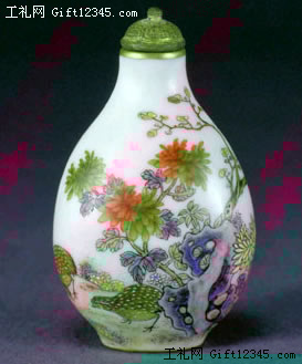 此煙壺上之圖案寓意“長(zhǎng)治久安”。畫(huà)面布局疏朗,色彩雅麗,運(yùn)用藍(lán)、紅、黃、綠、赭諸色繪制而成,采用先勾勒輪廓再填色的方法。顏色深淺不一,有立體效果。