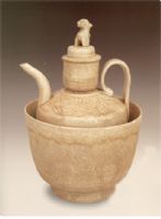 注子直口、筒形頸、圓腹、豐肩、淺圈足,直流微曲,扁平的把手上刻有兩道雙線紋,注蓋蓋頂塑一昂首翹尾的蹲獅形鈕;注碗深形,直口圈足,碗內(nèi)底有五個支釘,與注子底部五個墊燒痕相對。