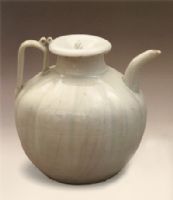 翻唇口,短頸,瓜稜球形腹,肩一側(cè)置流嘴,對稱的另一側(cè)肩腹部置把手,平底,壺蓋為荷花鈕,胎影青釉,為景德鎮(zhèn)窯產(chǎn)品。