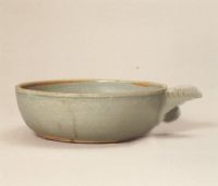 該瓷匜口微斂,平唇,淺腹,平底。其造型類似缽,但在口沿一側安有一槽狀流,流下附卷云形小鼻。通體施青白釉。口沿及外底部露胎,胎質細膩,在釉與露胎銜接處有火石紅痕。