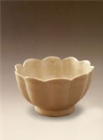 六瓣葵式口,深腹,矮圈足,內(nèi)底平展刻印云紋,器壁由葵口部順底有五道稜,腹素面,胎色灰白,施青釉,為龍泉窯產(chǎn)品。