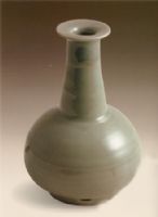 口沿平坦,直頸向下漸漸放開,頸部飾以兩道弦紋,鼓腹下垂,腹部飾弦紋一周,矮圈足,圈足側(cè)開有扁孔,釉色瑩潤欲滴,為純正的梅子青,此器不失為南宋龍泉窯之佳品。