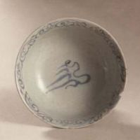 此高足碗造型、紋飾均與香港葛氏天民樓基金會所藏高足碗相似,但腹部似更深。值得指出的是此器內(nèi)壁有印花龍紋,并印有一個[玉]字,景德鎮(zhèn)元代瓷器上出現(xiàn)[玉]字并不是弧例,在青白瓷、卵白釉瓷上均已發(fā)現(xiàn),但青花瓷器上現(xiàn)出則是十分難得的,僅這一點即可證明此器的名貴。