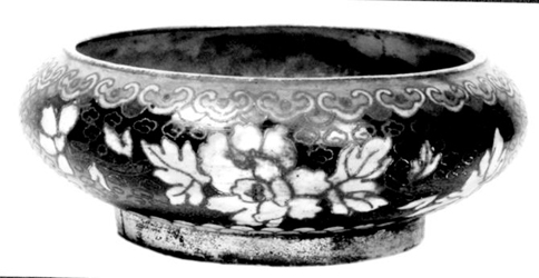 筆者家傳的這一景泰藍(lán)花卉筆洗,用紫銅制胎,胎厚約0.2厘米,呈敞口,鼓腹、圓形,高為6.1厘米,口徑為11.8厘米,底徑為9.5厘米,腹部的最大直徑為15.8厘米;外壁采用掐絲琺瑯工藝,制作了纏枝牡丹花卉,口沿還用卷云裝飾;內(nèi)壁全部涂了綠色琺瑯,有較多、較大的砂眼和坑凹;口沿和底沿,都鍍了銀,呈銀白色。整個筆洗的銅胎厚重堅實,色彩潤澤鮮明,掏絲整齊勻稱,鍍銀燦爛光亮,應(yīng)當(dāng)是清朝晚期的作品。