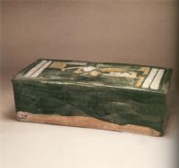 枕面兩側(cè)刻有詩(shī)一首:[閨中少婦不知愁,春日凝妝上翠樓。忽見陌頭楊柳色,悔教夫婿覓封侯。]枕中心依詩(shī)意刻劃人物圖案;胎色灰白、通體施黃、綠、白三色釉;枕面詩(shī)后有[隆興紀(jì)元春二月張沖珍玩]款,底有[張家造]戳印。