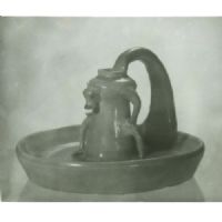 燈盤圓形,口外撇至口沿又向內(nèi)斂,底盤正中有一牛型油管,頂上和末端后壁均有方孔,可插燈芯。后面有彎曲把手,象征牛尾。牛的四肢上下并列,嘴及雙眼略施褐色點彩,釉色青黃,開冰裂紋。