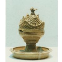 淺承盤,高足杯狀爐體,子母口,口沿飾二道弦紋,爐蓋作山峰起伏狀,四層,每層四等距小圓孔通爐體,飾有圓珠紋,海水紋,蓋頂塑一飛鳥,底部無釉,中空。